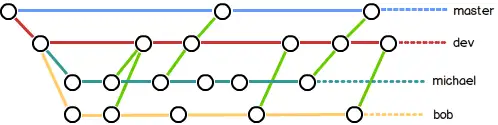 在实际开发中,我们应该按照几个基本原则进行分支管理:首先,master分支应该是非常稳定的,也就是仅用来发布新版本,平时不能在上面干活;那在哪干活呢?干活都在dev分支上,也就是说,dev分支是不稳定的,到某个时候,比如1.0版本发布时,再把dev分支合并到master上,在master分支发布1.0版本;你和你的小伙伴们每个人都在dev分支上干活,每个人都有自己的分支,时不时地往dev分支上合并就可以了。所以,团队合作的分支看起来就像这样: