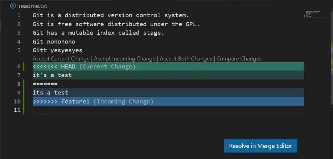 而如果我们此时新建并切换到一个feature1的分支,在这个分支下我们修改readme.txt添加最后一行并提交: