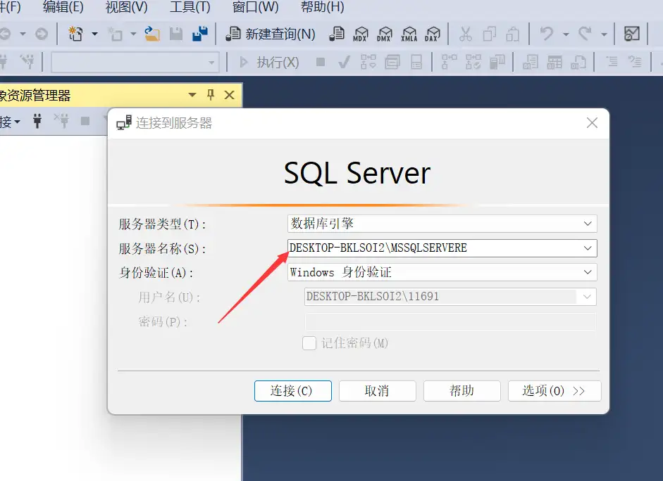 打开Microsoft SQL Server Management Studio,在登录页面记住一下这个服务器名 :