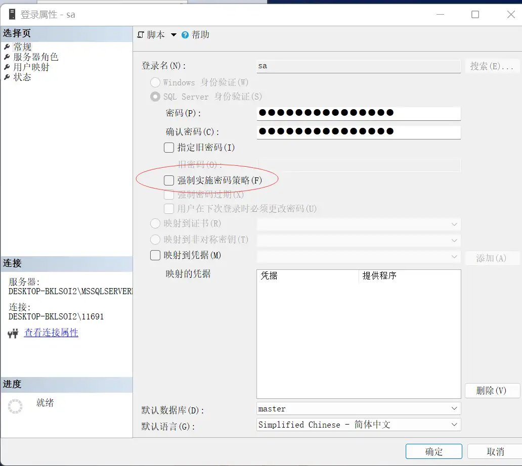 取消强制实施密码策略 ,并且设置好自己的密码。