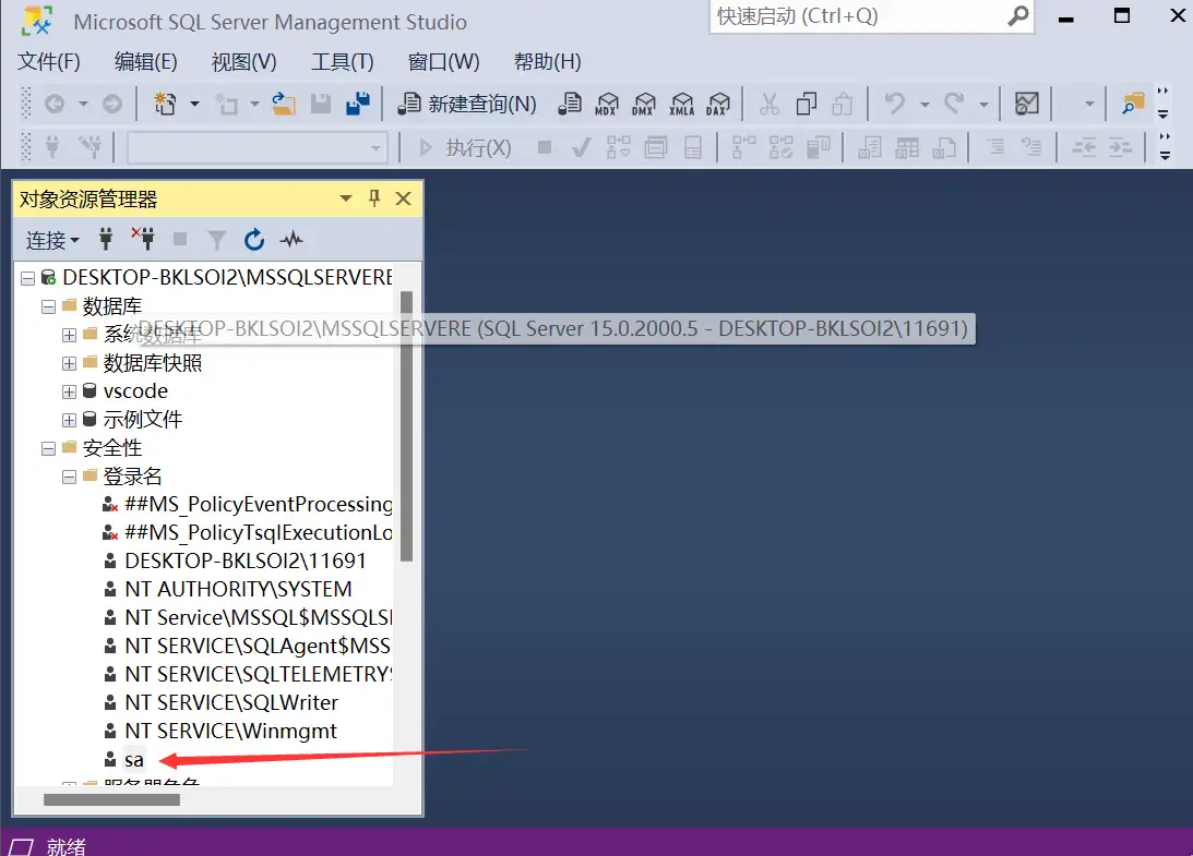 找到安全性,找到用户名sa ,右击属性: