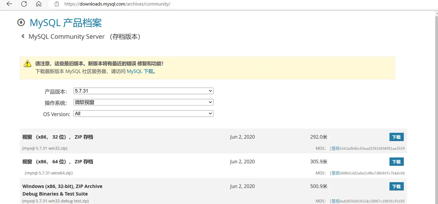 我在这里提供一下下载安装包的下载网址,大家可以直接进入选择合适自己的版本安装。(目前最新的版本已经达到了8.x,但是我下载的是5.7.31,这是一个兼容性较高的版本,因此接下来都是基于此版本的过程哦
