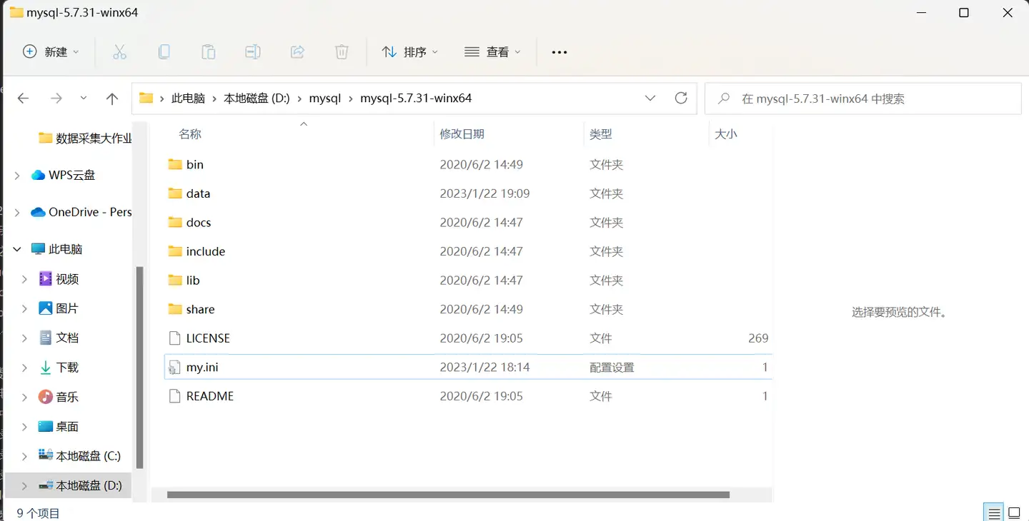 我们下载好安装包好,将其解压在一个我们可以记住的路径(路径中不要包含中文) 内,博主自己就是解压在D盘目录下的Mysql文件夹中。
